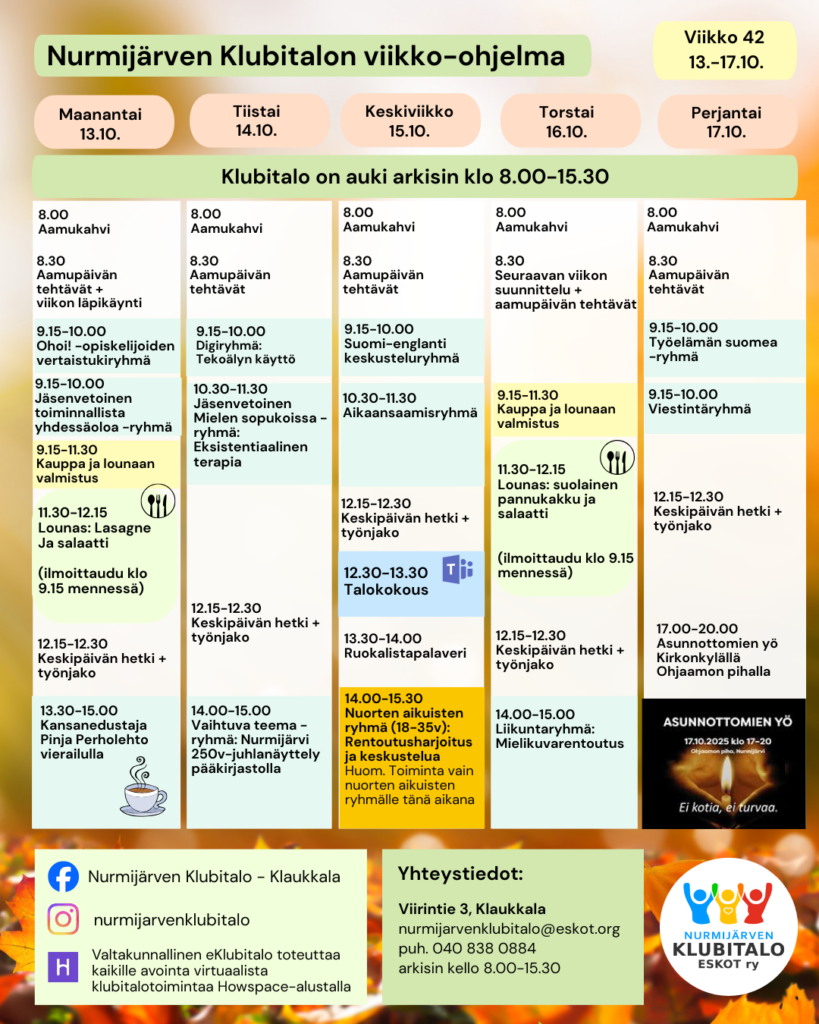 Viikko-ohjelma on saatavissa tekstimuotoisena Klubitalolta. Laita sähköpostia osoitteeseen nurmijarvenklubitalo@eskot.org.
